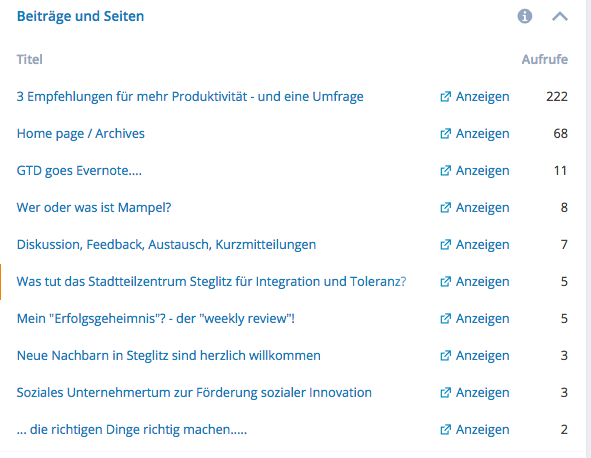 Ich freue mich immer sehr, wenn viele BesucherInnen meine Beiträge auf diesem Blog lesen. Manchmal erstaunt mich allerdings, dass die verschiedenen Artikel so unterschiedlich an- und aufgenommen werden. Mein Beitrag 3 Empfehlungen für mehr Produktivität – und eine Umfrage hatte allein heute (bis 21.30 Uhr) 222 Aufrufe zu verzeichnen – hinzu kommen rund 250 am gestrigen Tag – wohingegen mein heutiger Beitrag Was tut das Stadtteilzentrum Steglitz für Integration und Toleranz? gerade mal auf 5 kommt……